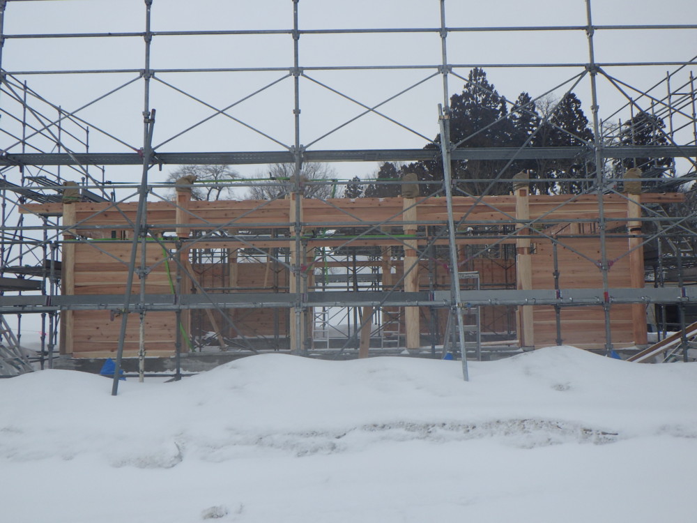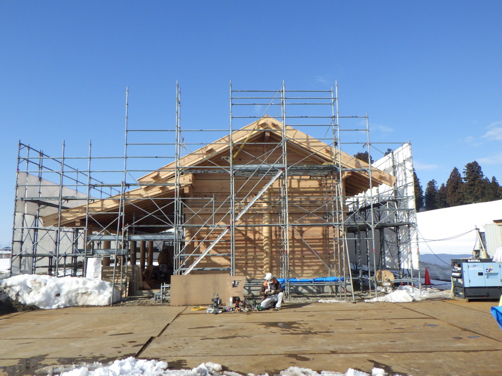 写真手前の梁は元々の材料のヒバ、奥の材料は今回設置した秋田杉です