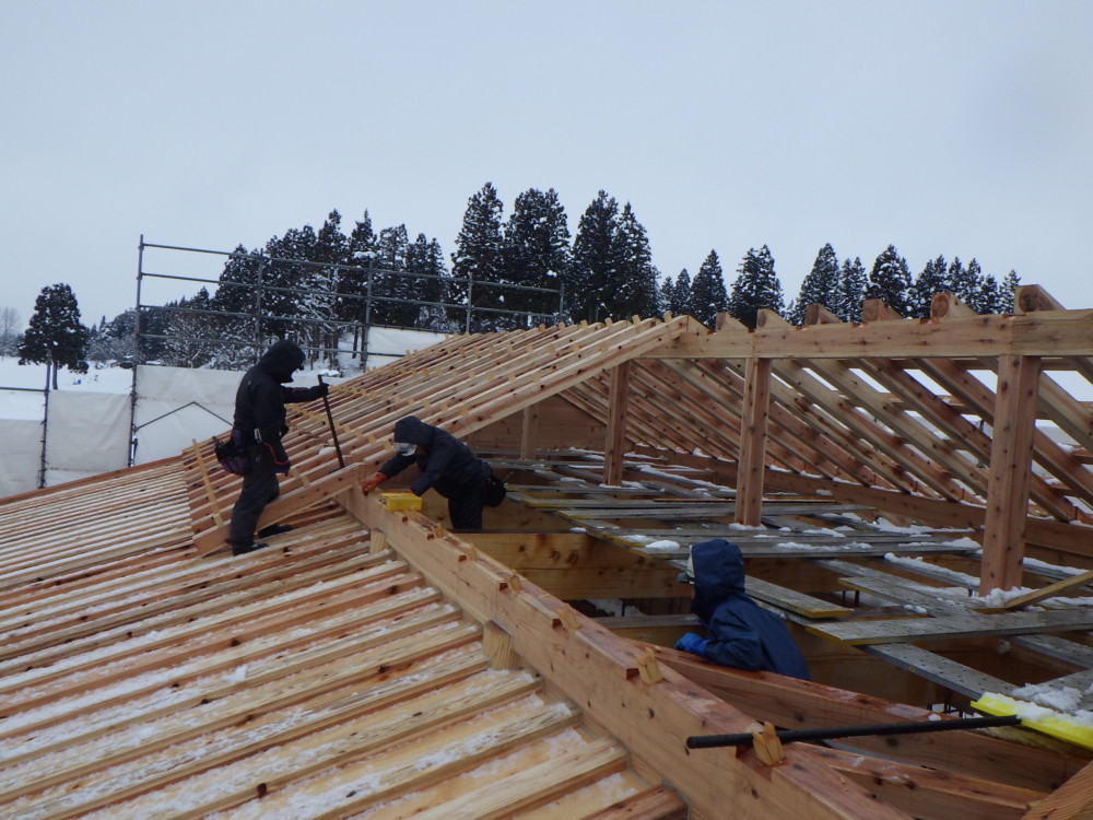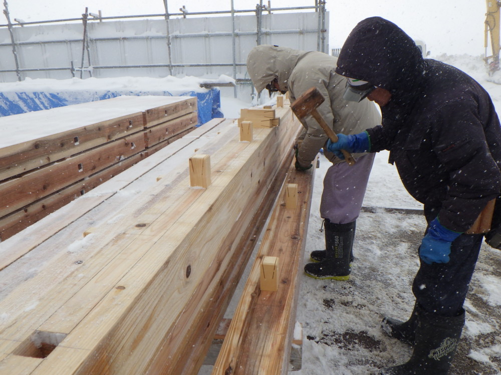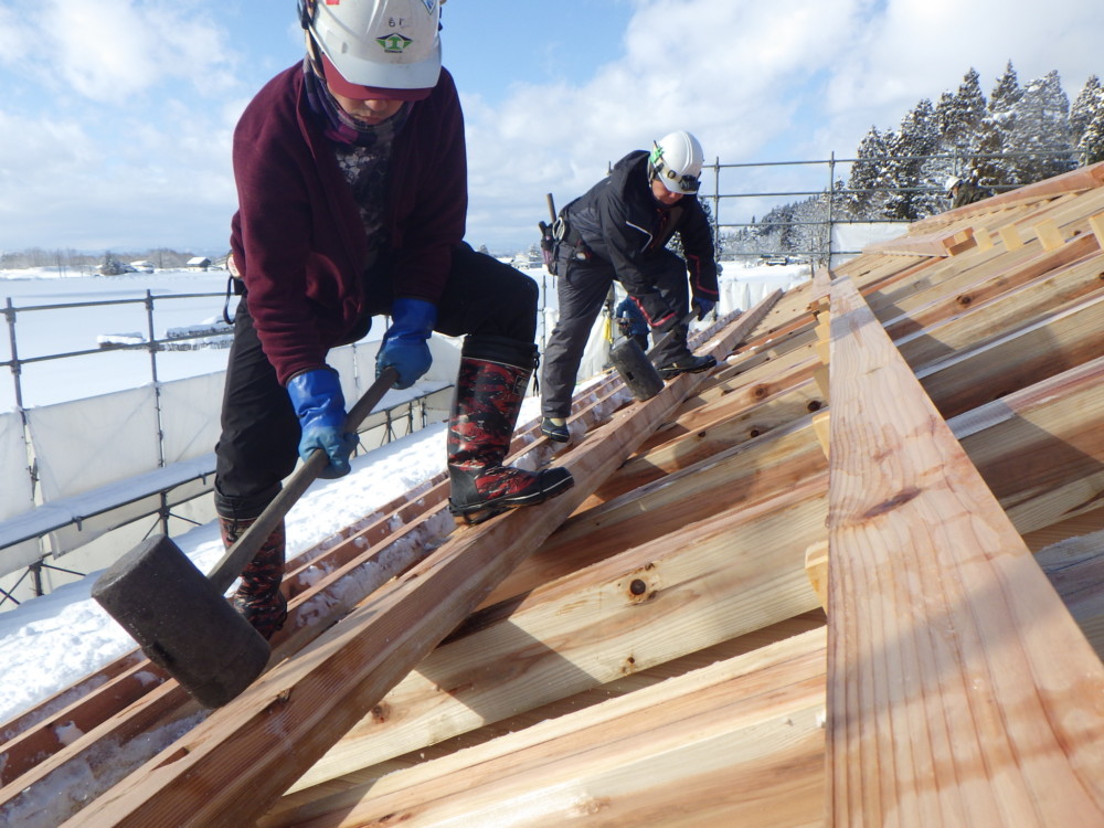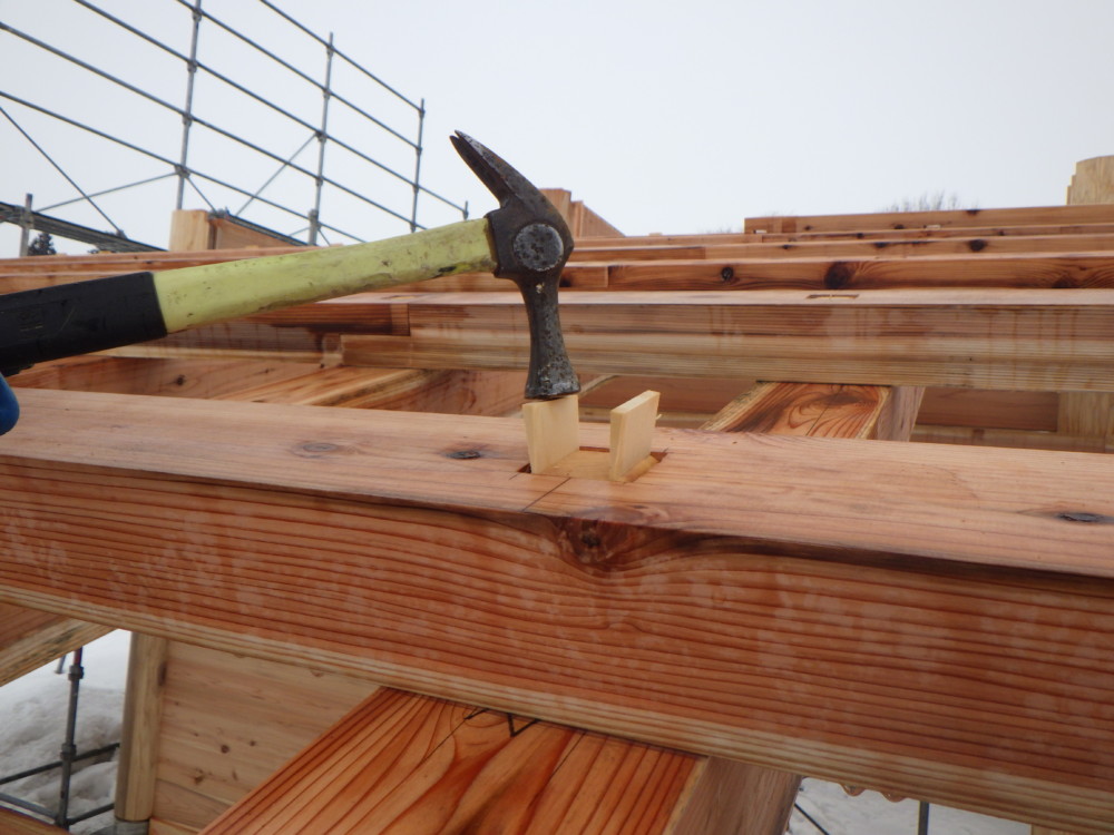 屋根の施工では桁(けた)や垂木(たるき)から出ている込栓に楔(くさび)を打ち、木材同士を金物を使わずに固定します